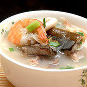 鳝鱼、虾、鱿鱼、大米、鸡汤、盐、葱。