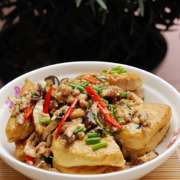 普宁豆干、干香菇、肉末、油、葱、蒜、红辣椒、生粉、生抽、蚝油、鸡粉、清水。