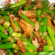 蒜苔、豆皮卷、肉丝、木耳、葱、花椒、盐、鸡精、酱油、油。