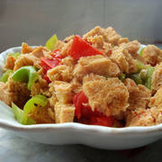 尖椒、冻豆腐、西红杮、葱、盐、鸡精、油。