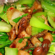 口蘑、油菜、猪肉、葱、花椒、盐、鸡精。