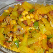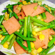 蒜苔、玉米、火腿肠、葱、盐、鸡精、油。