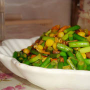 蒜苔、玉米、猪肉、葱、尖椒、盐、酱油、鸡精、油。