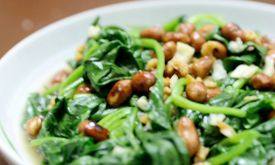 菠菜、花生米、花生油、陈醋、糖、鸡精、蒜、辣椒油。