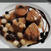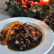 猪里脊、胡萝卜、葱、西芹、红酒、蔬菜汤、干樱桃、醋腌小洋葱、淀粉。