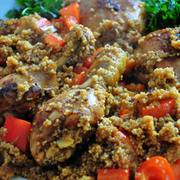 鸡腿、蒜、姜、橄榄油、洋葱、鸡汤、红甜椒、Couscous(快熟版)、西芹叶、甜椒粉、Harissa、姜黄粉、肉桂粉。