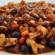 牛腿肉、洋葱、胡萝卜、芹菜、葱白、蒜、番茄罐头、番茄沙司、香叶、欧芹叶、柠檬皮、辣椒、红酒、牛肉高汤。