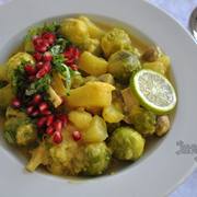 小甘蓝、土豆、新鲜棕蘑菇、姜、葱白、蒜、洋葱、椰奶、蔬菜汤、青柠、石榴、香菜、盐、胡椒、咖喱粉。