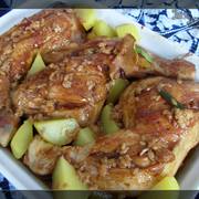 鸡腿、土豆、米酒、生抽、老抽、冰糖、盐、姜、辣椒、葱、绍兴酒。