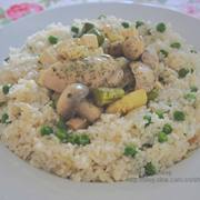 洋葱、鸡腿、白芦笋、绿芦笋、小新鲜白蘑菇、米饭、北豆腐、香叶、面粉、豌豆。