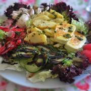 沙拉叶子蔬菜、土豆、蘑菇、黄瓜、心里美、橄榄油、干洋葱、干大蒜、干西芹、提契诺香料、盐、胡椒、覆盆子醋、Balsamico、干罗勒。