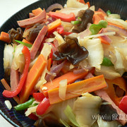 红柿子椒、胡萝卜、青椒、白菜小、木耳、小洋葱、葱 、火腿、盐、生抽。