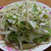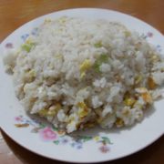 大米干饭、炒鸡蛋碎、娃娃菜叶、过滤麻油、葱花末、白醋、盐。