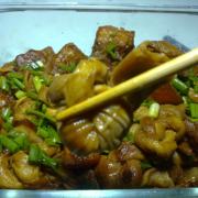 百叶结、五花肉、油豆腐、葱、姜、蒜末、生抽、老抽、黄酒、腐乳汁、麦芽糖。