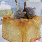 北海道吐司、水果、葡萄干、融化的黄油、细砂糖、冰激凌。