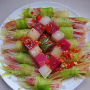 白萝卜、心里美、莴笋、西兰花、河虾、小米辣椒、蒜头、花生油、盐、老抽、淀粉。