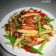卤肥肠、白豆腐干、芹菜、辣椒、花生油、盐。