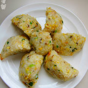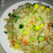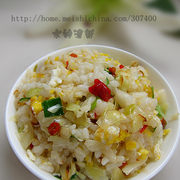 米饭、鸡肉、黄瓜、胡萝卜、玉米、香菇、葱、油、盐。