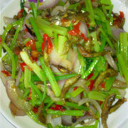 火焙鱼、洋葱、芹菜、辣椒、油、盐、味精。