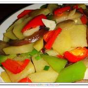 土豆、茄子、青红椒、蒜、葱、油、盐、生抽、料酒、鸡精。