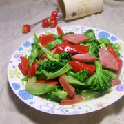 西兰花、红彩椒、火腿、油盐、淀粉、鸡精、花椒。