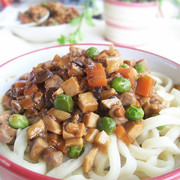 面粉、清水、豆干、豌豆、猪肉、香菇、胡萝卜、大蒜、生姜、水淀。