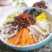 鲜鸡蛋面、金针菇、胡萝卜、黄豆芽、鲜香菇、黄彩椒、海苔、猪肉末、料酒、欣和豆瓣酱、油盐、葱姜。