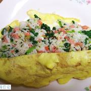米饭、鸡蛋、虾仁、火腿、菠菜、葱花、油、盐。