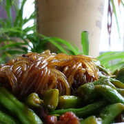四季豆、粉条、肉丝、葱姜蒜、酱油、蚝油、料酒、味精、盐、鸡精。