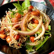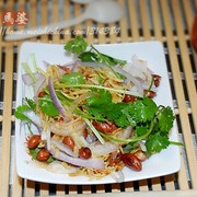 粉丝、花生米、洋葱、香菜、盐、生抽、陈醋、白糖、花生油。