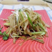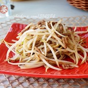 绿豆芽、猪瘦肉、葱、盐、食醋、花椒、花生油。