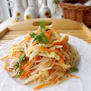胡萝卜、粉丝、姜、葱、鸡蛋、香菜、蒜瓣、盐、生抽、白醋、香油、熟芝麻。