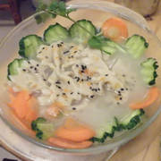 面粉、胡萝卜、黄瓜、葱、香菜 、熟芝麻、高汤料、盐。