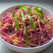 紫甘蓝、土豆、白芝麻、蒜碎、酱油、盐、糖、醋、蚝油、玉米胚芽油、香油。