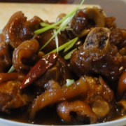 蹄膀、姜片、八角、桂皮、冰糖、老抽、干辣椒。