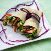 黄豆芽、豌豆苗、豆皮、韭菜苔、胡萝卜、鲜虾、里脊肉、紫甘蓝、料酒、生抽、甜面酱、盐、糖、淀粉。