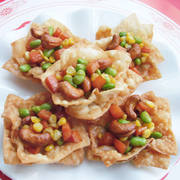 馄饨皮、腰果、火腿、玉米、胡萝卜、青豆。