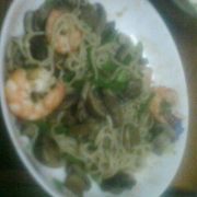 大葱姜、大虾、口蘑、青椒、三鲜伊面。
