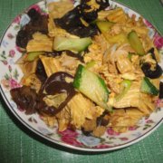 木耳、黄瓜、腐竹、鸡蛋、里脊肉、葱、盐、鸡精、酱油。