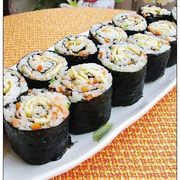 米饭、海苔、胡萝卜、火腿肠、香菇、黄瓜、鸡蛋、盐。