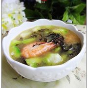 丝瓜、海虾、紫菜、蒜、盐、胡椒粉、芝麻油。