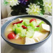 丝瓜、豆腐、圣女果、葱、红椒、高汤精、盐、芝麻油。