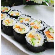 米饭、鸡蛋、寿司海苔、火腿肠、胡萝卜、黄瓜、芝麻、白醋、盐、糖、芝麻油。