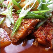带鱼、白萝卜、洋葱、杭椒、大葱片、老抽、生抽、蒜末、韩国辣椒酱、辣椒粉、姜末、料酒、糖。