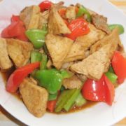豆腐、青椒、红椒、猪肉片、豆瓣酱、蒜末、生抽、老抽、料酒、白糖、盐、水淀粉。