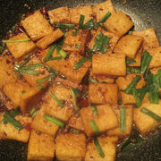 北豆腐、韭菜、蒜瓣、干辣椒、花生油、水、葱花、姜末、盐、糖、老干妈豆豉油辣椒酱、花椒、大料。