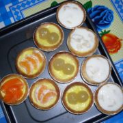 牛奶、鸡蛋、炼乳、塔皮、葡萄罐头、橘子、果肉酸奶、木瓜。