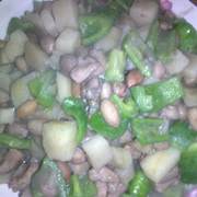 土豆、青椒、花生、肉、葱花、盐。