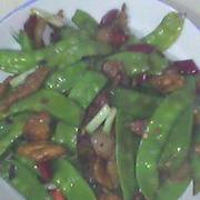 豌豆片、猪肉、葱、红辣椒、信用油、味精、酱油。