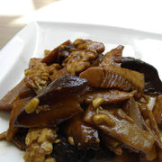 天贝、苦瓜、红椒、木耳、大葱、姜、蒜、油、豆瓣酱、醋、老抽、糖、盐、白胡椒粉。